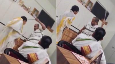 वेद विद्यालय में शिक्षक की पिटाई, छात्र को छड़ी से पीटा; CCTV में कैद