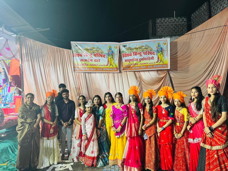 आनंद गौर हरदा । विश्व हिंदू परिषद बजरंग दल तहसील रहटगांव टीम द्वारा सिद्ध खेड़ापति हनुमान मंदिर समिति मित्र मंडल केमैया मोहल्ला में प्रतिवर्ष अनुसार इस वर्ष भी भारत माता विराजित की गई मां भारती के पांडाल में दुर्गा वाहिनी द्वारा शस्त्र पूजन तलवार बाजी रानी लक्ष्मी बाई , भारत माता , रानी पद्मावती , दुर्गा जी की झांकीया एवं लव जिहाद जैसे विषय पर कविताएं एवं उद्बोधन दिया व तिनका सामाजिक संस्था द्वारा कई प्रदर्शन किए जिसमें हाथों से फारसी फोड़ना, सिर पर नारियल फोड़ना, पेट पर छड़ी मोड़ना, कांच की ट्यूबलाइट खाना, लोहे की किलों पर के ऊपर लेटना, पेट पर से बाइक निकालना जैसे कई प्रदर्शन किया।