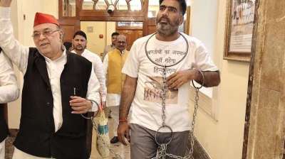 यूपी में बजट सत्र में सपा का प्रदर्शन, विधायक हाथ पैरों में जंजीर पहने दिखे