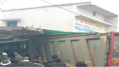 रेत से भरा तेज रफ्तार हाईवा दो मंजिला दुकान में घुसा, ड्राइवर को निकाला बाहर