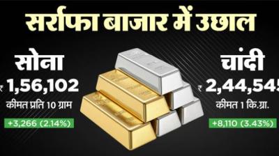 सोने-चांदी कीमतों में शुक्रवार को तेजी देखने को मिली। चांदी की कीमत 3580 रुपये की उछाल के साथ 2.41 लाख प्रति किलो पर पहुंच गई। वहीं सोने का भाव 2090...